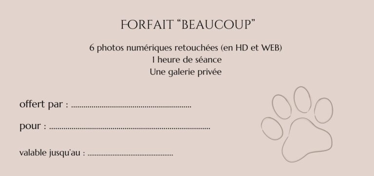 Vous pourrez profiter de cette offre par exemple lors du suivi de votre chiot, en effectuant une première séance à ses 3 mois, puis à ses 6 mois (une photo offerte) et enfin à ses 1 an (deux photos offertes). Ou encore pour immortaliser votre compagnon au cours des différentes saisons, dans les fleurs, dans les feuilles d’automne et la neige.